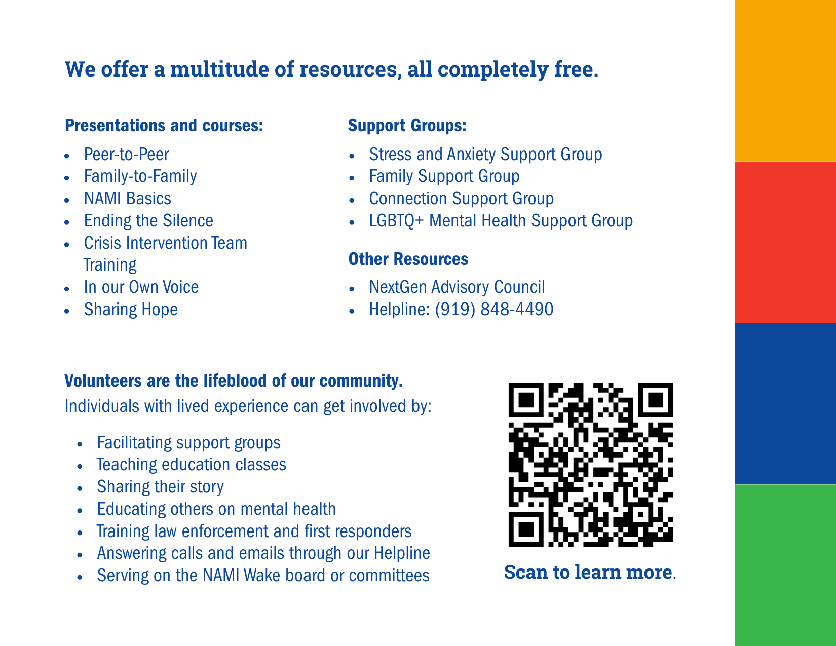 Promotional postcard providing an overview of NAMI Wake County and its resources