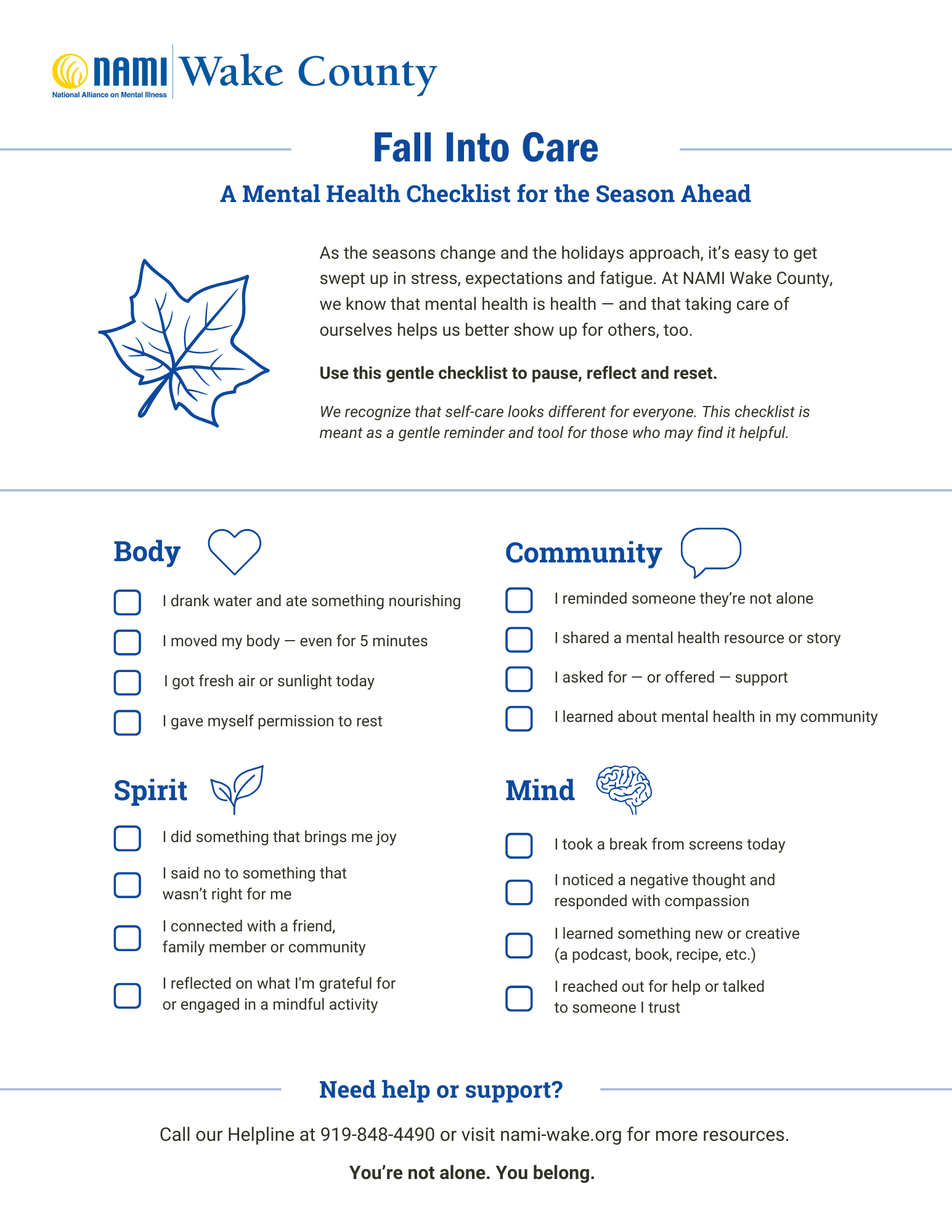 Downloadable self-care checklist to be posted on nami-wake.com and shared in end-of-year donor communications